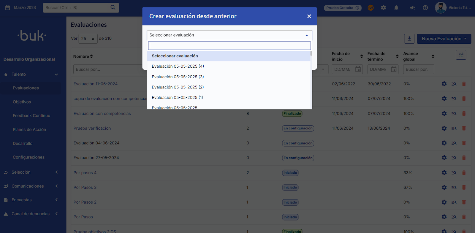 Se você selecionou a opção “A partir de uma avaliação anterior”, será aberta uma nova aba onde você deverá escolher a avaliação que deseja usar como referência, e começará com alguns campos já preenchidos e configurações previamente estabelecidas.