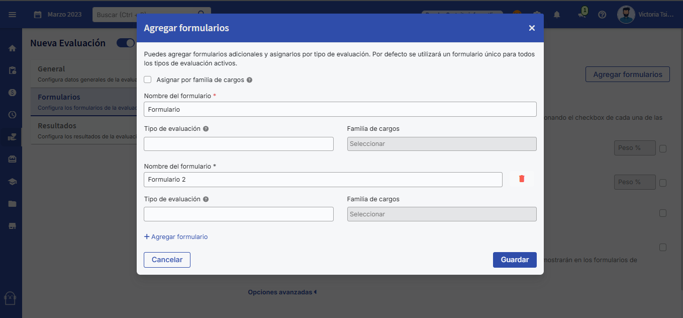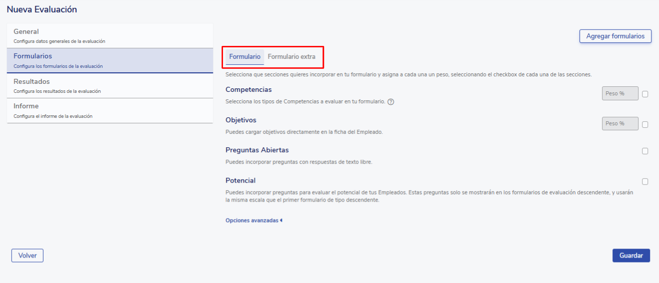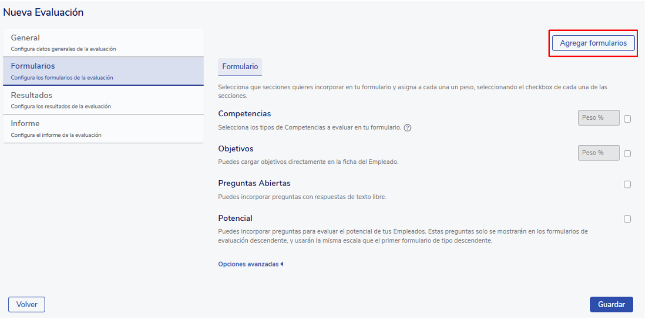 Nesta etapa, você pode configurar um ou mais formulários de avaliação, que podem ser únicos ou diferentes para cada tipo de avaliação.