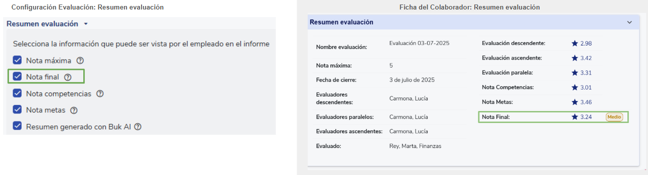 - Ao desmarcar a caixaNota objetivos/metas, esse campo será ocultado na seçãoResumo da avaliaçãoe também será ocultada a coluna Nota Final dentro da seçãoDetalhe de objetivos/metas.