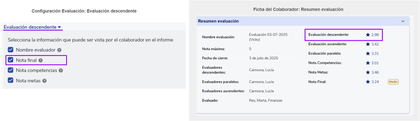 - Mostrar o formulário ao avaliador descendente:Apenas se a avaliação já foi concluída, permite mostrar o formulário ao avaliador descendente.