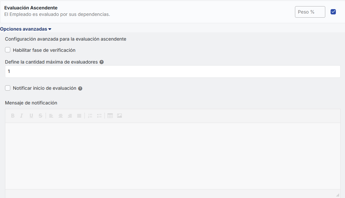 - Mensagem de notificação:É habilitada se a opção de notificar início da avaliação estiver ativada. Aqui você pode escrever a mensagem que será enviada aos avaliadores quando a avaliação começar.
