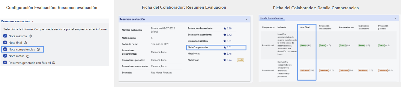 - Ao desmarcar a caixaNota competências, esse campo será ocultado na seçãoResumo da avaliaçãoe também será ocultada a coluna Nota Final dentro da seçãoDetalhe de competências.