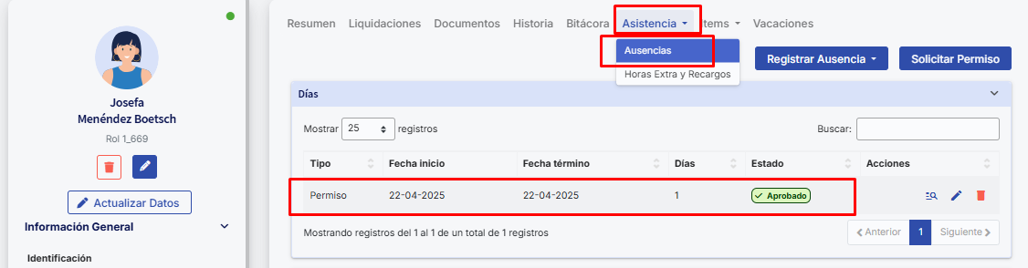 Uma vez que o benefício integrado com permissões seja aprovado (por meio do fluxo de aprovação de chefia, RH, ambos ou nenhum, conforme a configuração), o colaborador poderá visualizá-lo em sua ficha, na seção "Assistência > Ausências".