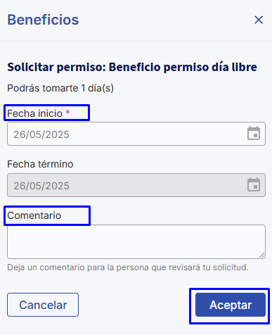 - Día completo: Você deverá inserir a data de Início e o sistema atribuirá automaticamente a quantidade de dias consecutivos ou dia único concedidos pelo seu empregador.