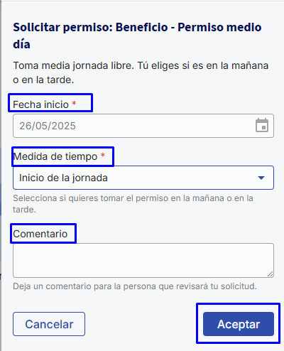 - Meia jornada: Você deverá inserir a data de Início e, na caixa Medida de tempo, indicar se esta meia jornada será no início da jornada (AM) ou no final da jornada (PM) e adicionar um comentário.