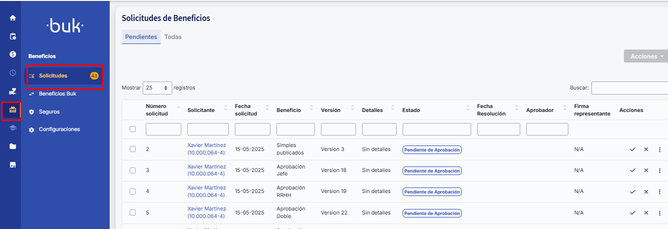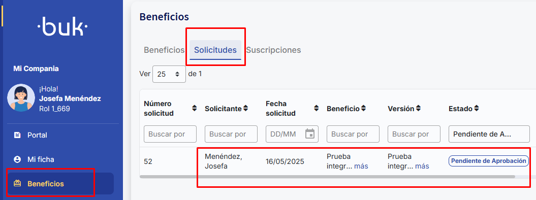 Por outro lado, el Administrador de beneficios podrá visualizar las solicitudes que están pendentes de aprobación na opção Benefícios >> Solicitudes, opção visível apenas para usuários com permissões de aprobación de beneficios: