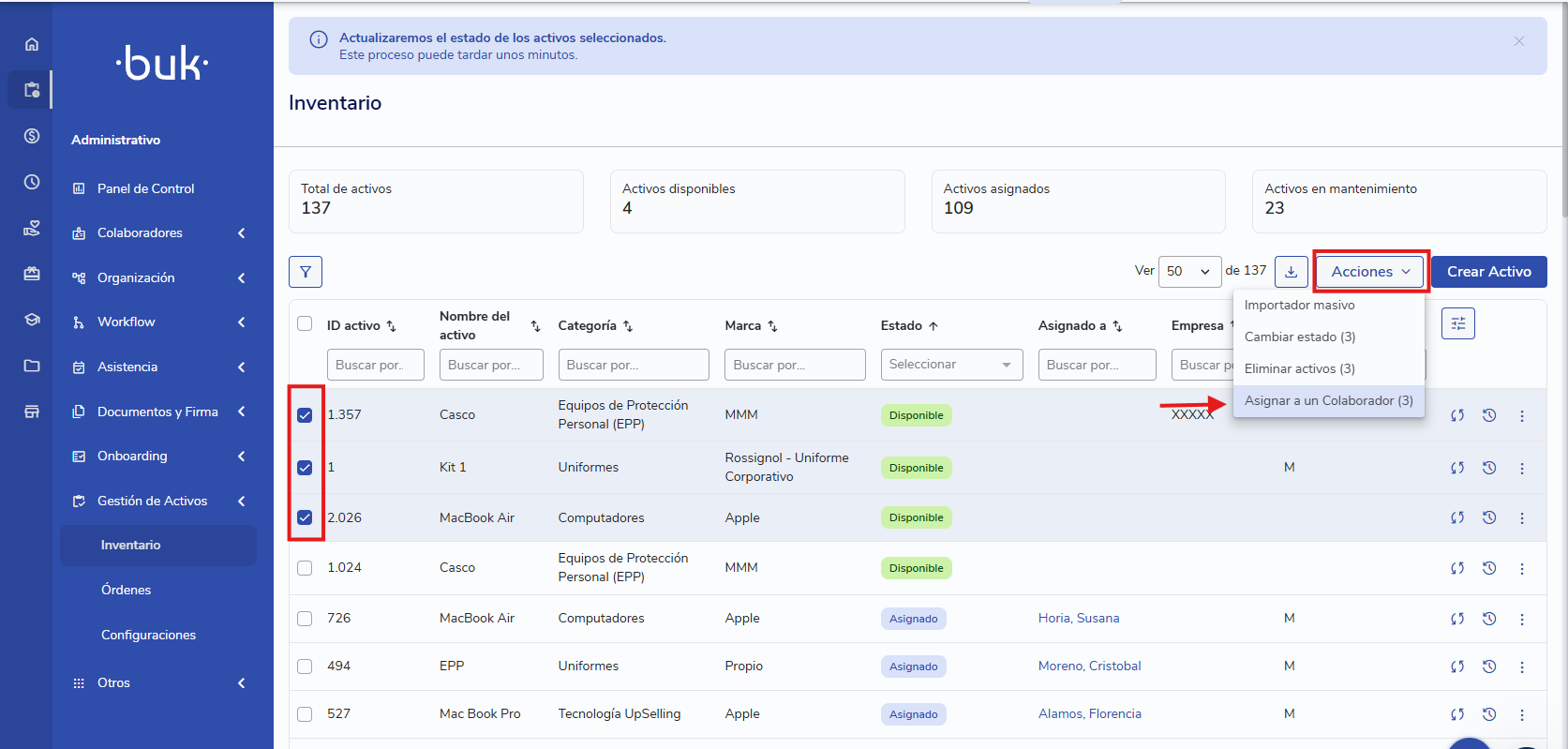 Selecione os ativos a serem atribuídos e clique em Ações > Atribuir a um Colaborador.