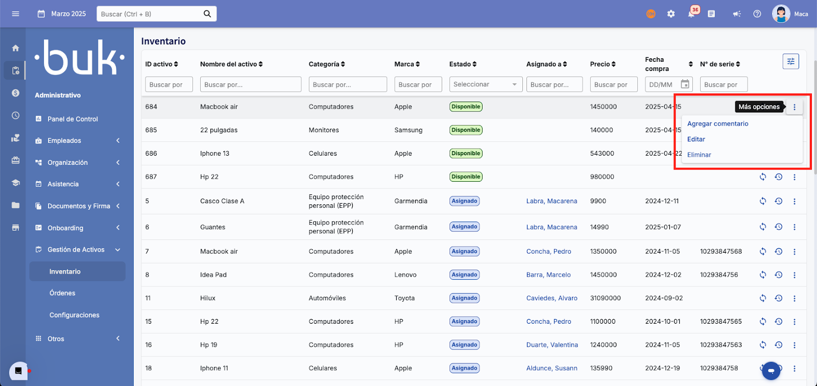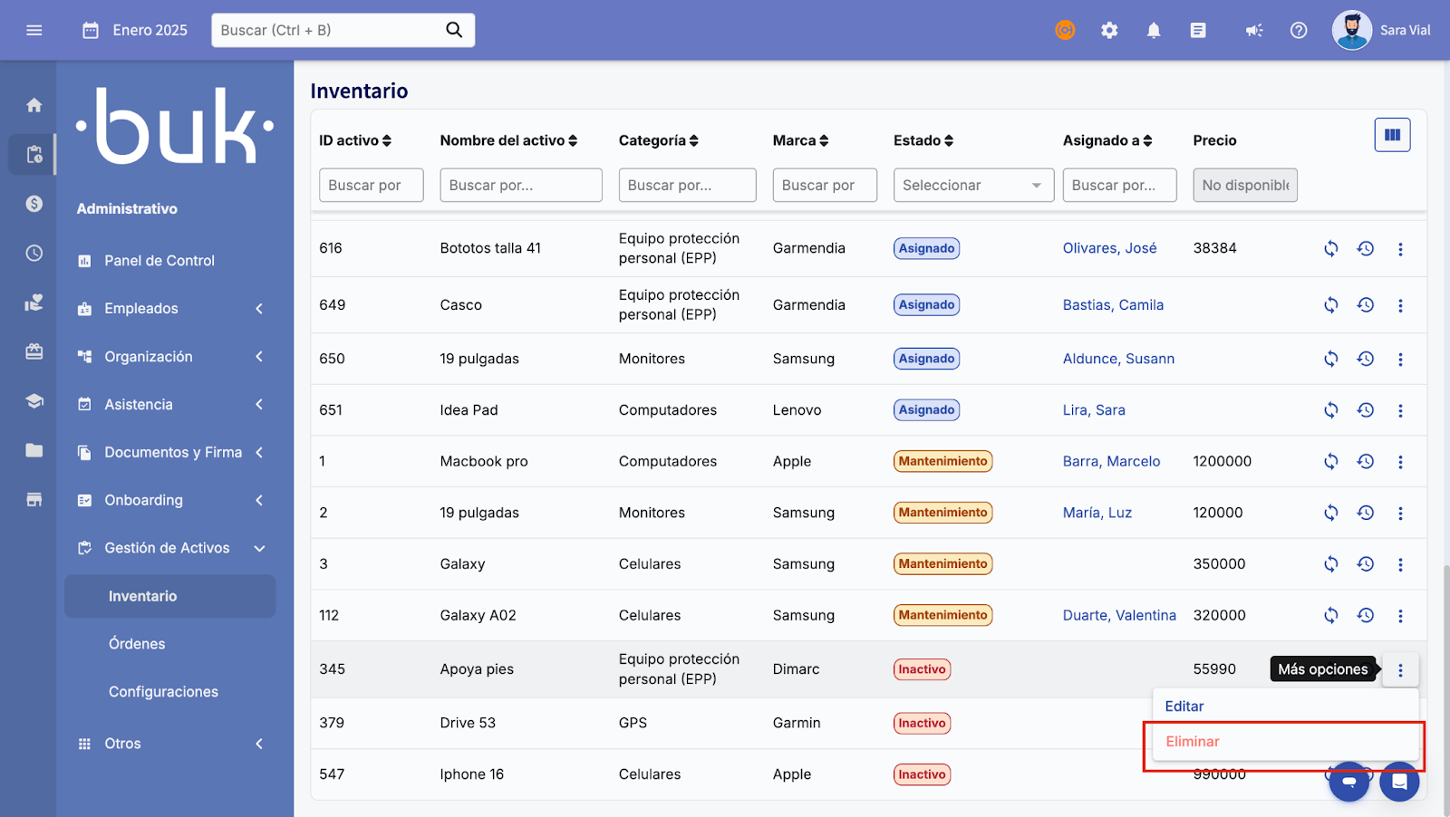 Existem diferentes ações que permitem gerenciar seu inventário: