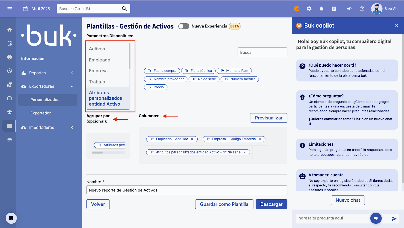 - Nesta visualização aparecem os parâmetros disponíveis, destes é possível escolher agrupar por certos parâmetros e quais colunas incluir no exportador.