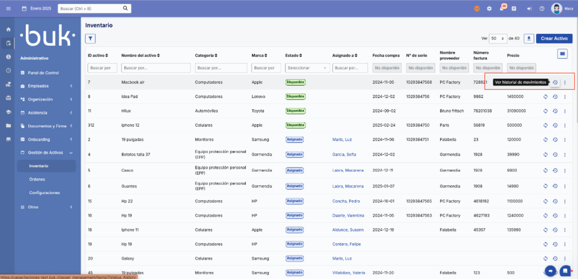 Histórico de movimentos (para ver todos os movimentos anteriores do ativo)