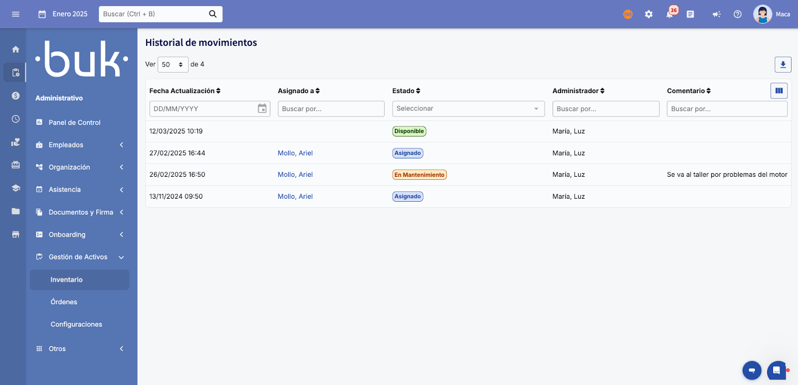 Cada alteração que você fizer — como reatribuições, manutenções ou baixas — fica registrada automaticamente no histórico. Isso garante rastreabilidade completa, com comentários e datas para auditar qualquer movimento.