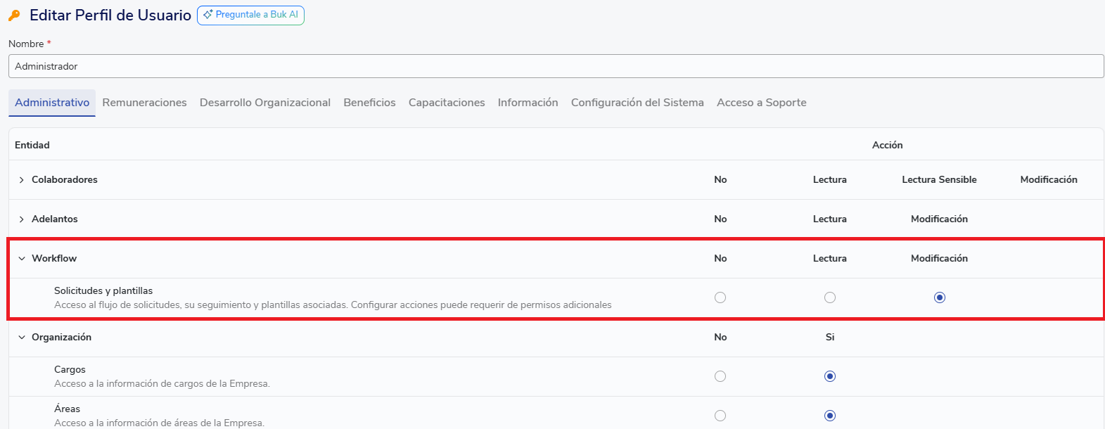 O acesso dos usuários ao módulo do Workflow é definido por três níveis de permissões, configuráveis no módulo de Usuarios y Perfiles (se você tiver as permissões necessárias). Estes se agrupam sob el nombre“Workflow > Solicitudes y plantillas”: