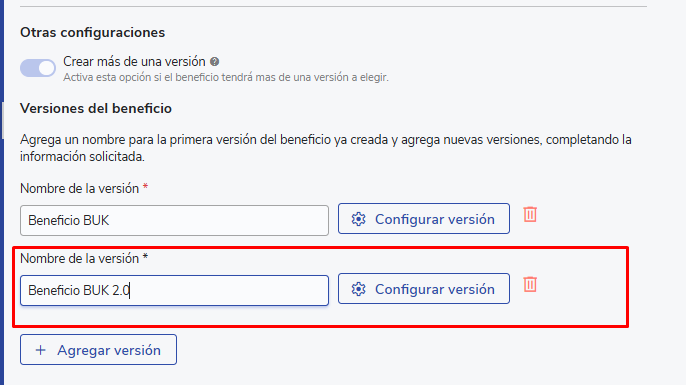 Para adicionar versões você deve ir à opção“Outras configuraciones”e ativar a função“Criar mais de uma versão”(lembre-se que cada benefício é automaticamente criado com a versão original, ou seja, o nome original do benefício, e você poderá adicionar mais versões conforme sua necessidade).