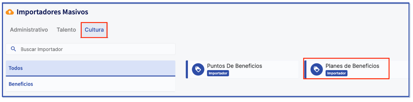 Você poderá carregar os planos de benefícios em massa dirigindo-se ao módulo "Información" em "Importadores" e então clicando em "Importadores"; ali, você poderá localizar o importador "Planes de Beneficios". Ao adicionar dessa forma seus colaboradores, você os estará escolhendo de forma permanente e não com base em condições automáticas.