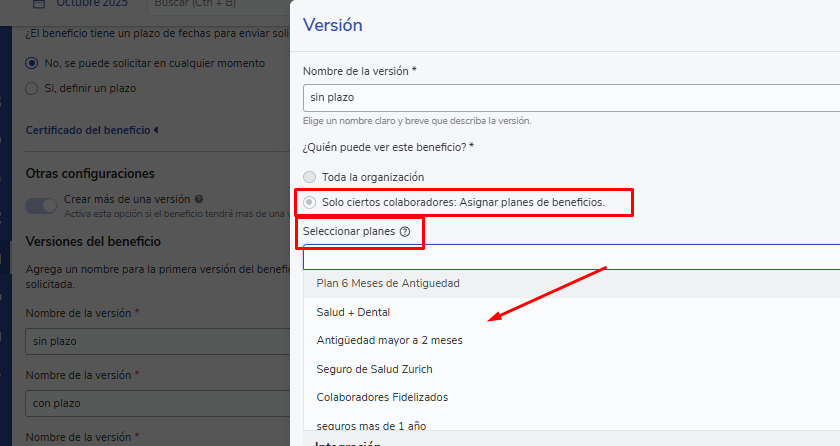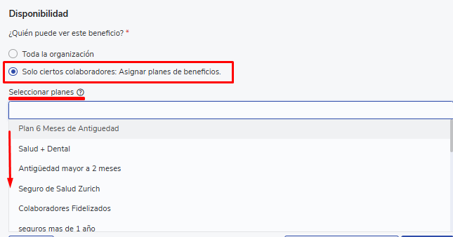 Uma versão de benefício pode ser adicionada diretamente a um plano de benefícios no momento de sua criação ou quando o edita, lembre-se de selecionar na opção"Disponibilidad"a alternativa"Solo ciertos colaboradores: Asignar planes de beneficiospara que sejam exibidos os planos previamente criados.