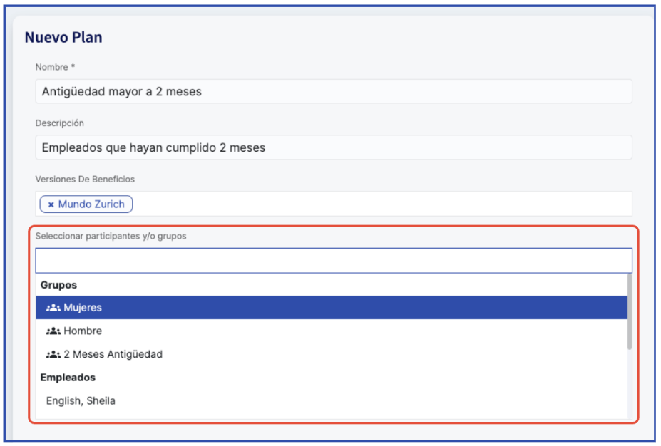 Ao selecionar"Nuevo Plan", insira o nome do plano, uma descrição opcional e escolha os funcionários ou grupos beneficiários na opção "Seleccionar participantes y/o grupos". Nessa caixa, você pode adicionar participantes manualmente ou utilizar um grupo baseado em condições específicas, o que permite manter os beneficiários atualizados conforme essas condições. Consulte este link para mais informações sobre "Grupos de colaboradores baseados em condiciones".