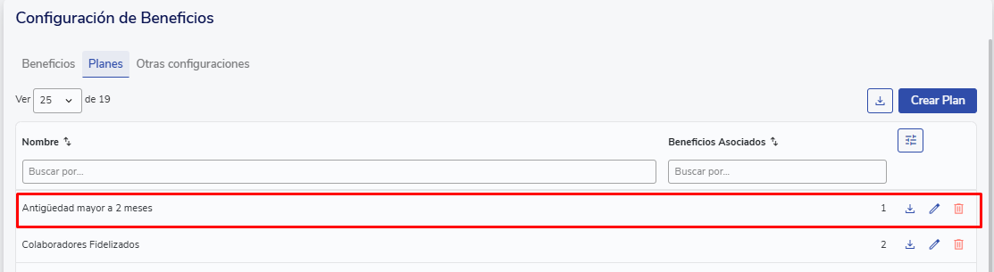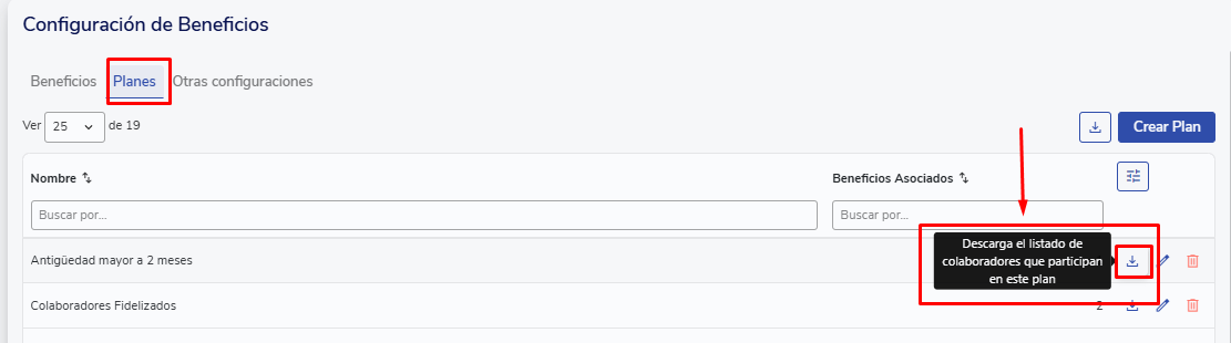 Uma vez adicionados os participantes ou grupos, pressione "Crear Plan". Assim, os planos estarão disponíveis para edição ou eliminação na aba "Planes" para os usuários com permisos de gestión de beneficios.
