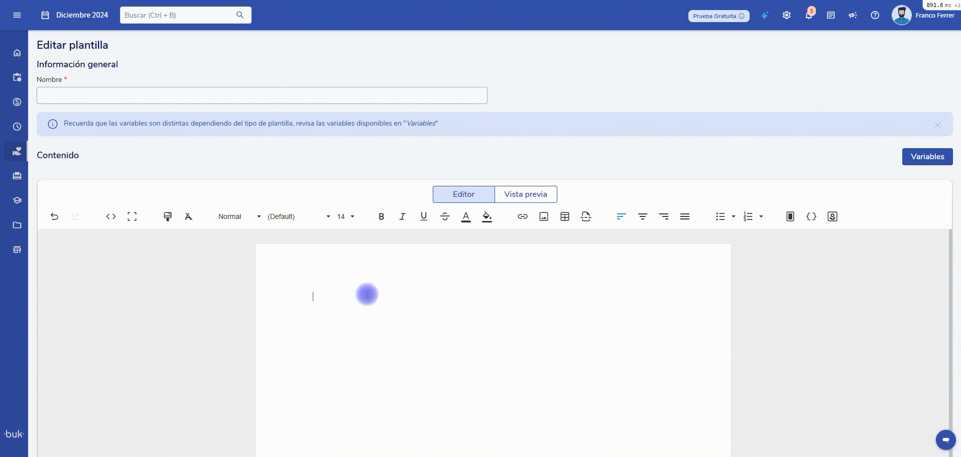 Antes, os usuários precisavam saber o nome exato das variáveis Liquid (por exemplo,{{empleado.nombre}}), o que gerava dúvidas frequentes e erros ao criar ou modificar templates.