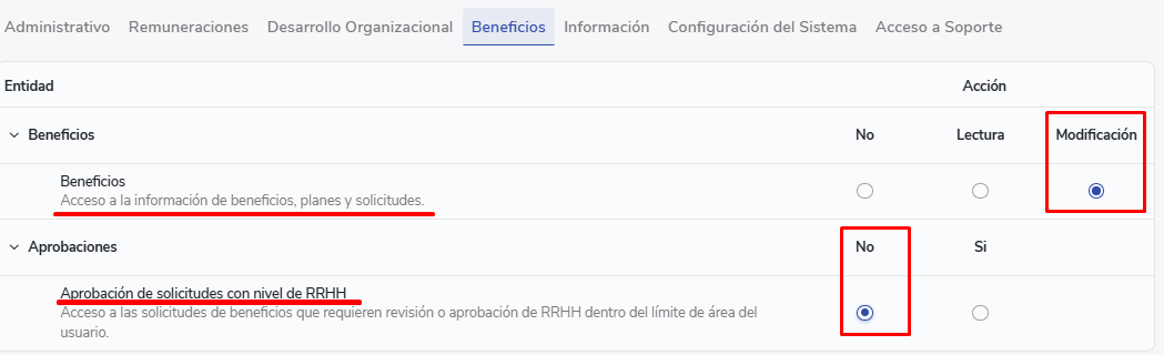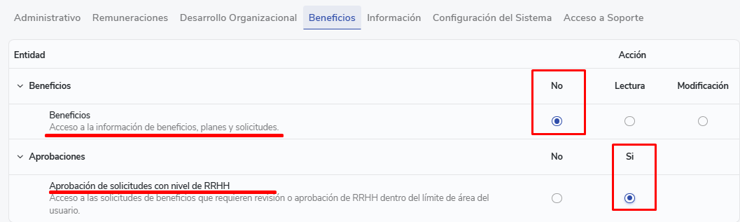 - Aprovações:Você terá acesso para aprovar todas as solicitações com nível de aprovação RRHH. Poderá fazê-lo mesmo que tenha límite de área, mas apenas sobre solicitações dentro desse límite. Essa permissão foi pensada para usuários que necessitam participar da aprovação de solicitações sem necessariamente ter acesso para modificar benefícios, configurações ou planos.