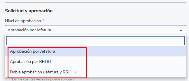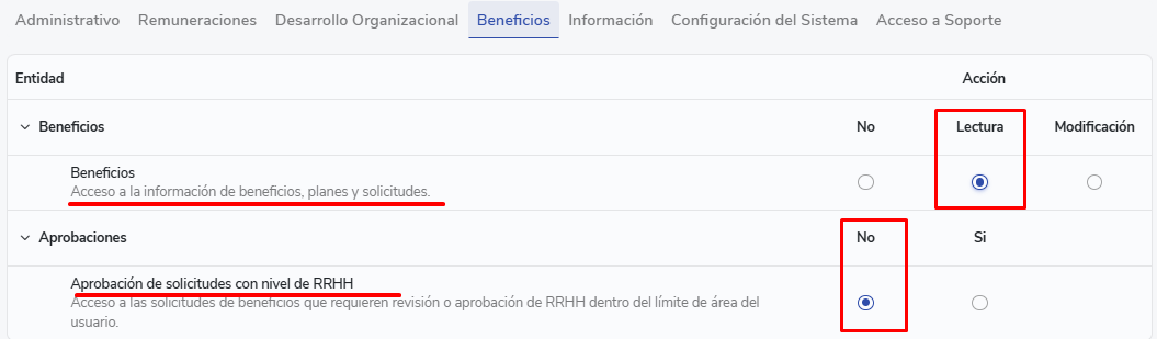 - Aprovação de Benefícios:Não existem requisitos de límite de áreas para a aprovação de benefícios com nível de aprovação RRHH.